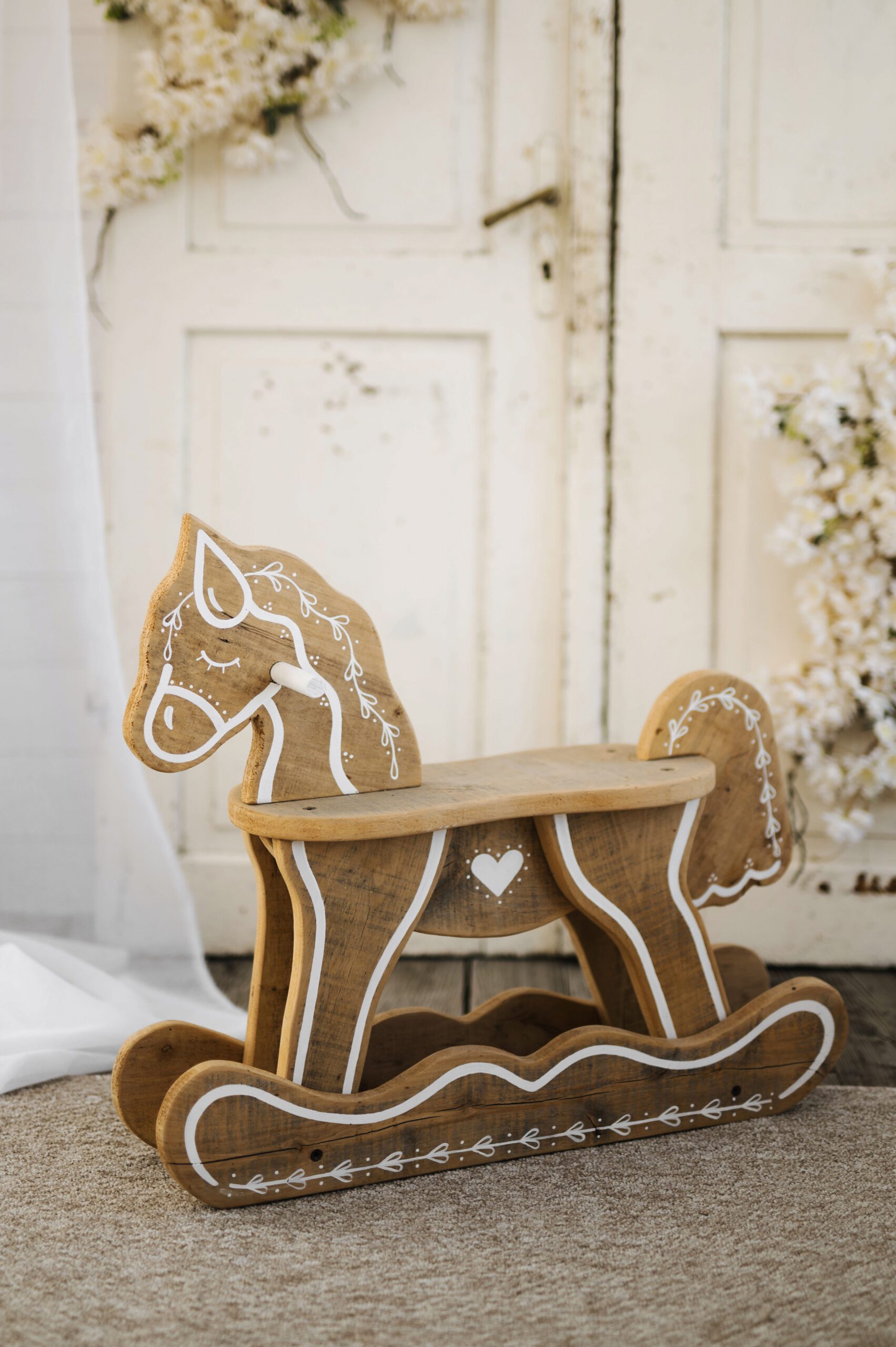 Das Pferd ist handbemalt und aus altem Holz gefertigt.