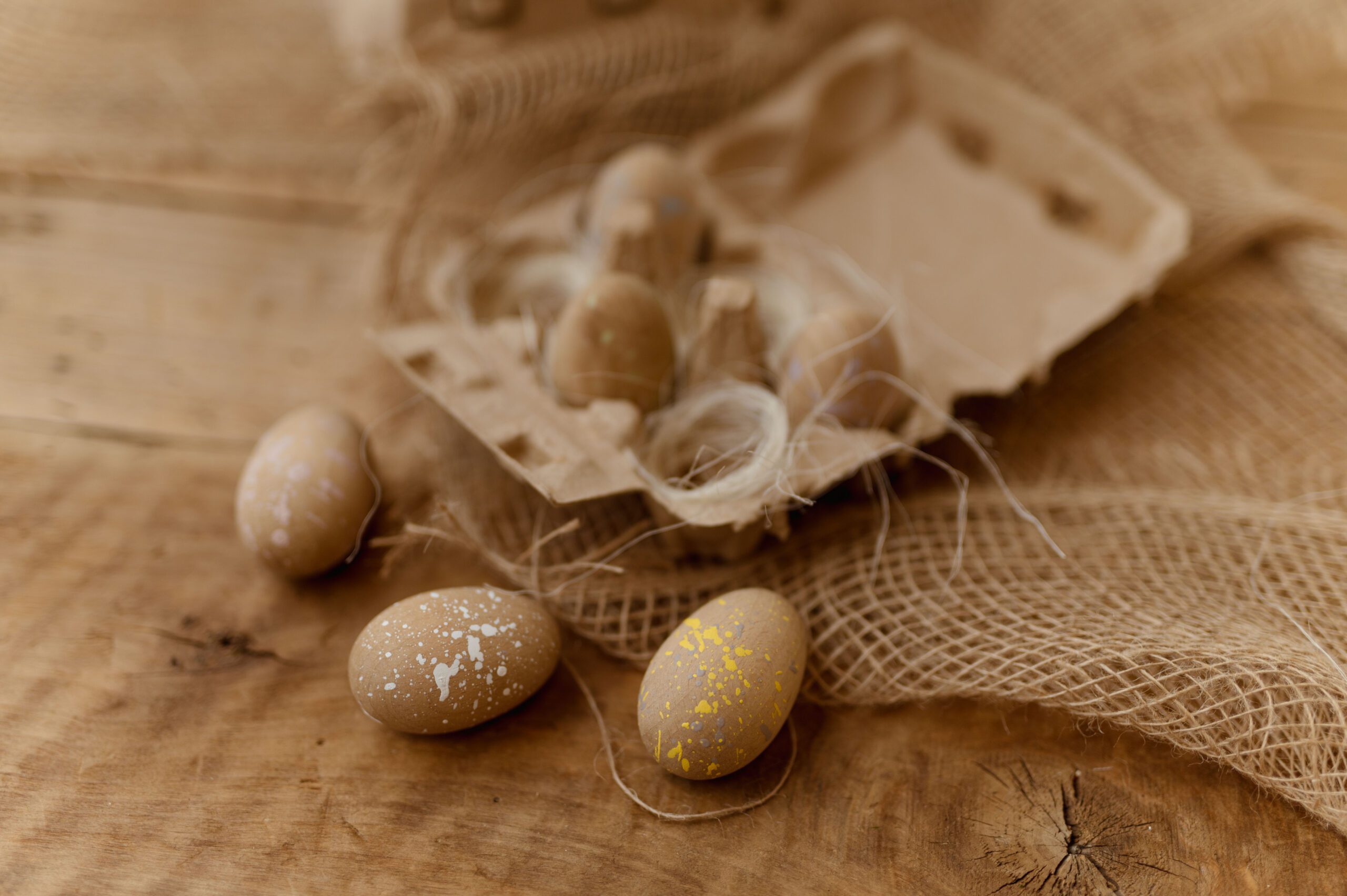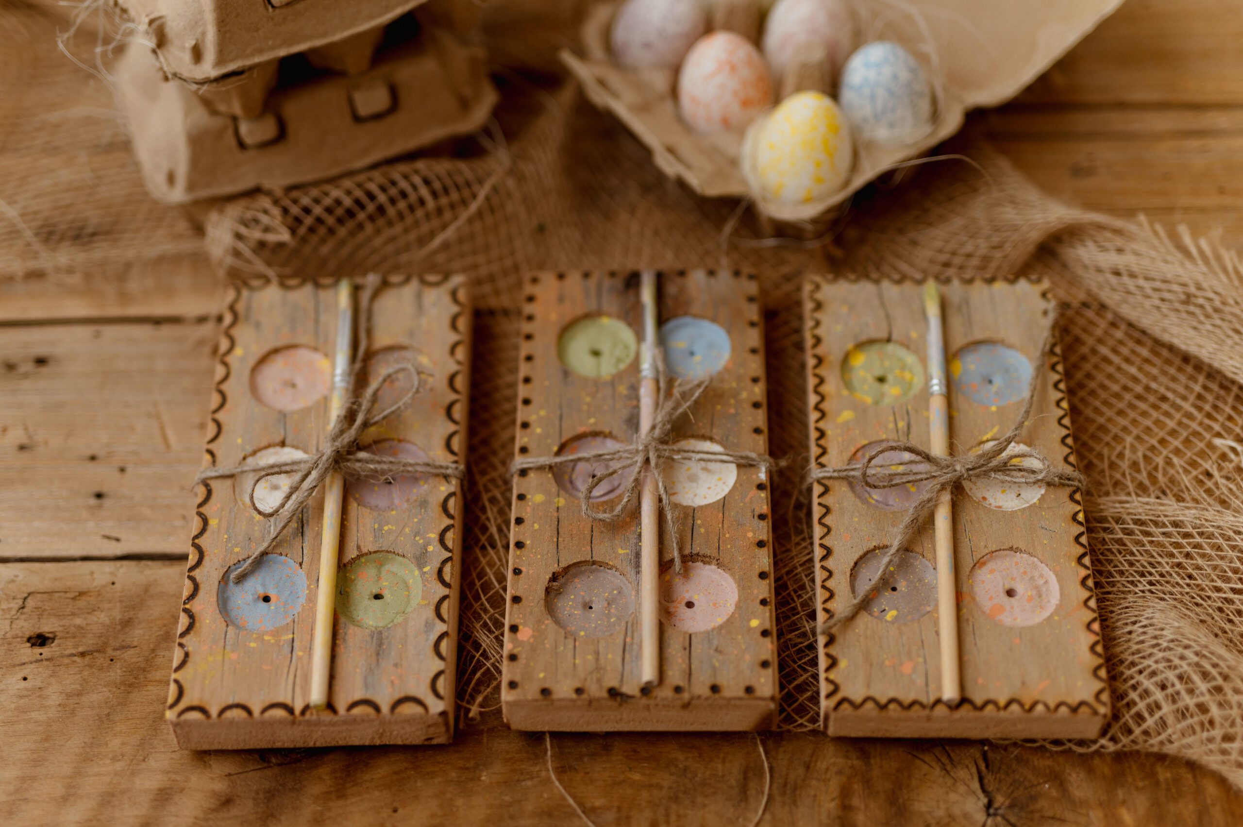 Wooden paints with 6 holes filled with paint in pastel colours. The set additionally includes a brush along with a set of 6 L eggs in an extrusion. The wooden eggs feature a hand-painted spotted design.